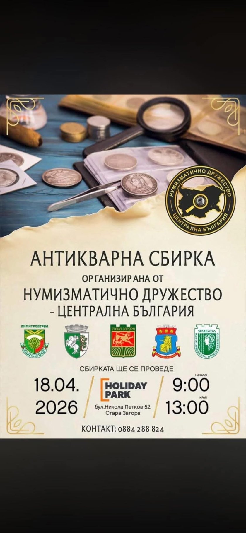 Нумизматично дружество „Централна България“ Ви кани на Антикварна сбирка, която ще се проведе на 18 април 2026 г. от 09:00 ч. в Holiday Park Стара Загора, етаж 2, в Стара Загора.