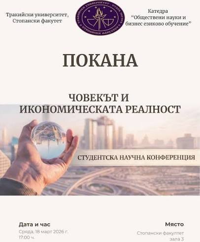 Стопанският факултет на Тракийския университет в Стара Загора организира студентска научна конференция под заглавие „Човекът и икономическата реалност“. Събитието се провежда за първи път. То дава трибуна на студенти, които представят собствени изследвания по теми от ежедневния икономически и социален живот.