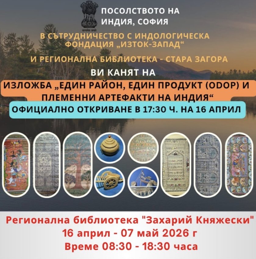 Стара Загора приема международна културна експозиция, която рядко стига до българска публика. Изложбата „Един район, един продукт – племенни артефакти на Индия“ ще бъде открита на 16 април 2026 г. от 17:30 ч. Мястото е Регионална библиотека „Захарий Княжески“.