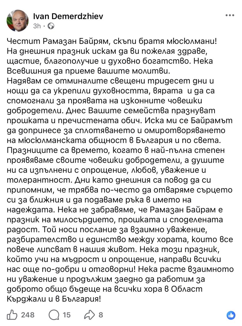 Надявам се отминалите свещени тридесет дни и нощи да са укрепили духовността и вярата ви, и да са спомогнали за проявата на изконните човешки добродетели. Днес вашите семейства празнуват прошката и пречистената обич. Иска ми се Байрамът да допринесе за сплотяването и омиротворяването на мюсюлманската общност в България и по света.