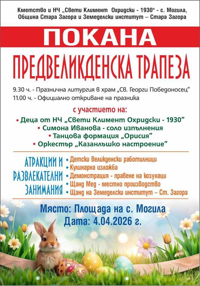 На 4 април 2026 г. село Могила, община Стара Загора, ще отбележи Лазаровден с празнично събитие под името „Предвеликденска трапеза“.