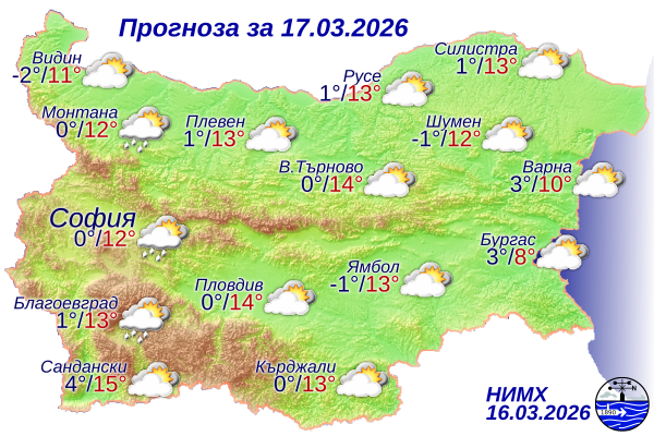 Днес над по-голямата част от България облачността ще бъде значителна. В следобедните часове на места, главно в планинските райони на Западна България, ще има превалявания от дъжд, а по високите части – от сняг. Ще духа умерен източен вятър. Максималните температури ще бъдат между 10° и 15°, а в София около 12°.