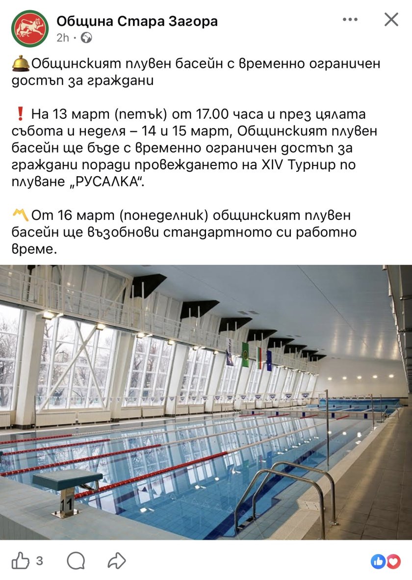 Достъпът на граждани до Общинския плувен басейн в Стара Загора ще бъде временно ограничен заради провеждането на XIV Турнир по плуване „Русалка“. Това съобщиха от официалната Facebook страница на общината.